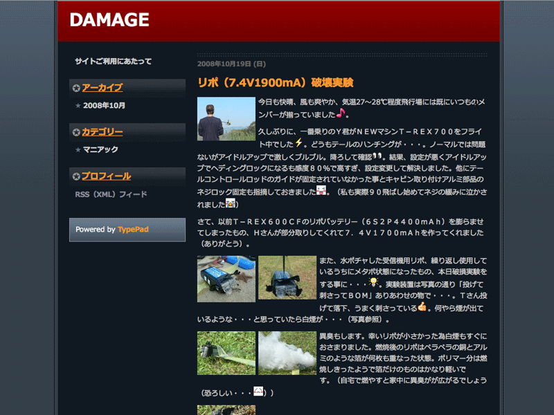 いつも飛行場で3Dフライトを楽しまれているI戸さんですが、最近になってブログを立ち上げられたようです。その名も【DAMAGE】。意味深なタイトルですが、いろんな話題を扱っておられるようなので、T-REX使いの方には参考になるブログだと思います。今後の展開が期待されます。