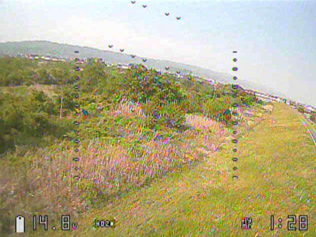 昨日カメラマウントを修復した220はマウントを大きくしすぎたためか、5吋ペラだとマウントに干渉してしまう事態に。仕方ないので210用の4吋ペラで飛ばしてみました。意外にも軽快でいい感じに飛んでくれたのでこれもありかな、と(^^♪ 今日はFPVのみでバッテリを使い切りました。とりあえずコースなどは定めず行ったり来たりを繰り返しましたが、併せてどれくらい遠くまで飛ばせるのか検証してみました。