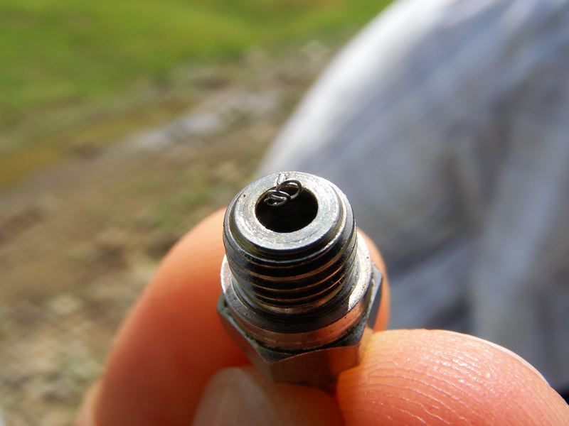 この土曜日、仕事帰りに芝のタネでも蒔きに行こうと飛行場によってみました。直前の雷雨のため地面はかなりの水たまりですが、I戸さんがBravoを持ってやってきていました。エンジンの修理が終わったとのことで今日が久々のフライトです。午前中はエンジンがかからなかったそうですが、プラグが切れていたとのこと。フィラメントが完全に焼き切れていました。