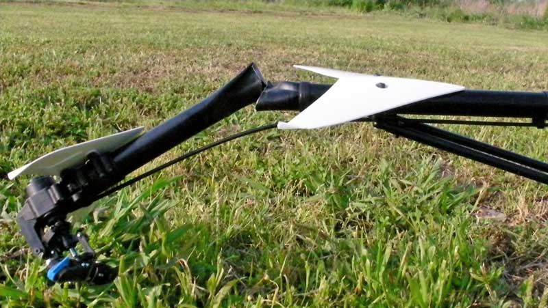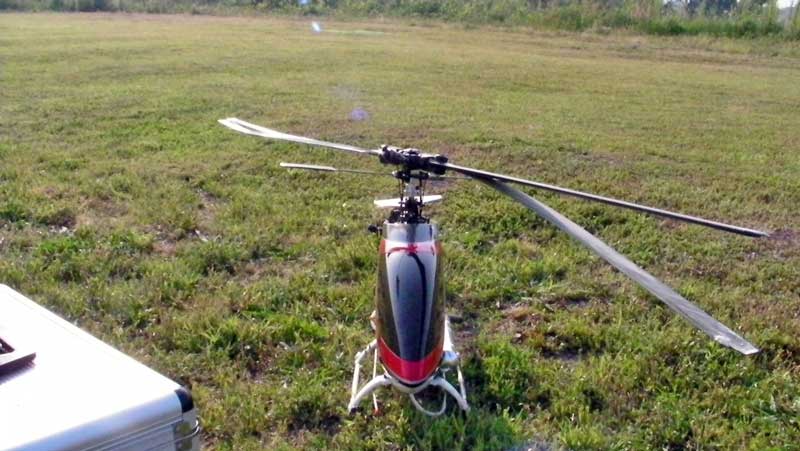 最近上空以外にも凝りだしたのがローパス。風もなくいい感じで何度かローパスを練習していましたが、上空へ逃がす寸前にマイナスピッチを入れすぎ地面と接触。わずかに前傾姿勢でメインローターが接触、その後テールパイプにヒット。エンジンカットしましたがGP4は2枚ともバラバラ、テールパイプは完全破断となりました。太くなったD3テールハウジングも根本から曲がっており衝撃の強さがわかります。横転しなかったため、キャビンやリンケージ、ヘッド部分は見た目元気。う〜ん、こりゃ修理に結構