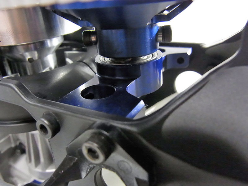 エンジンの芯だしは20/100程度の振れだったので、アルミ箔シムをかませながらなんとか3/100程度へ。もう少し粘ろうかと思いましたが、ネジを脱着するだけでも1/100程度は変わってしまいそうなのでこのあたりで妥結しました。エンジンマウントはそれまで使っていたQuickの4点止めから純正のSD-Gパーツへ。また、ロワーマストベアリングホルダーもSD-Gパーツに変えました。樹脂だとTSで留めるようになってますが、こいつはいつものM3CSできっちり留められるので良さげな感じ