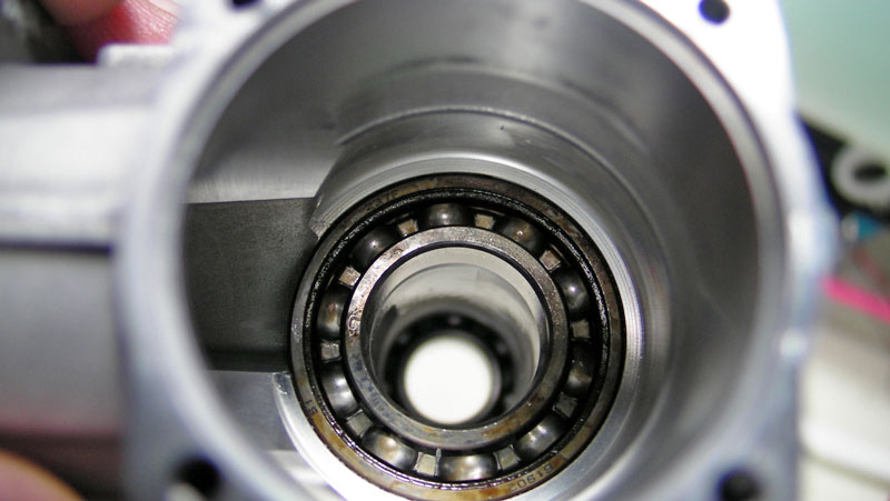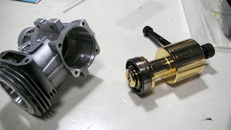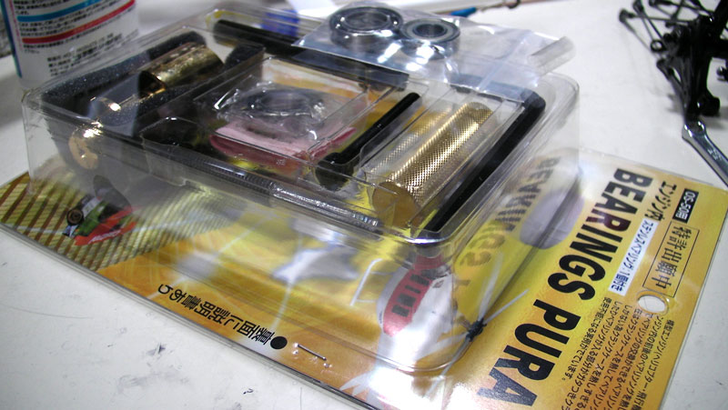 エンジンはベアリングも交換することにしたので、今回は荒井製作所のプーラーを使ってベアリングを抜去しました。専用工具だけあって簡単に外せますが、アンカーボルトでも代用できそうな感じです(^^;; このプーラーキットにはリア用のステンレスベアリングが付属するのですが、おまけとしてもう一組F/Rベアリングセットが添付されていました。結構太っ腹です(^^;;