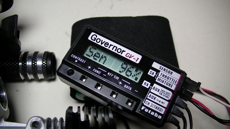 が降ったりやんだり怪しげなお天気の木曜日、3Dをしている方なら一度はつけたことが有るであろうアイテム、ガバナーを搭載することにしました。今回取り付けるのはFutabaのGV-1。液晶ディスプレイ付きの多機能ガバナーです。簡単に言えばローター回転数が一定になる装置。ローター回転が上がれば