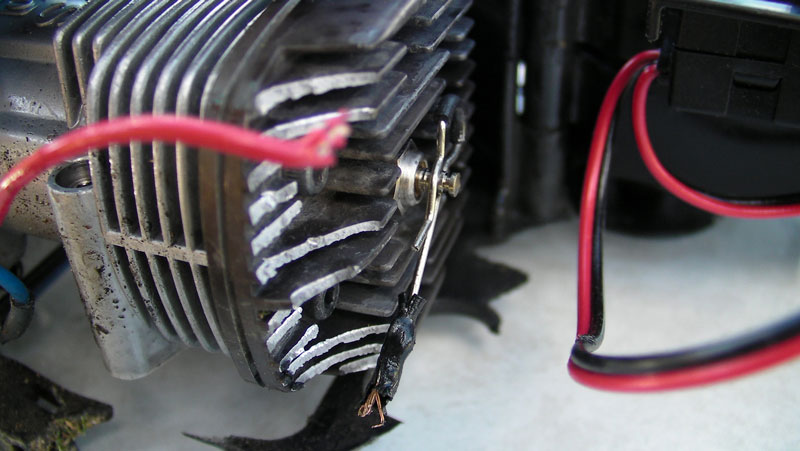 回収してみると、機体はもちろんですが、エンジンヘッドカバーも破損、お気に入りのHATORIマフラーもボルトごと外れています。これぐらいだったらタップを切り直せばOK?と思いましたが、よく見ると溶接部にクラックと穴が空いてい るようです・・・。アルミですし【カン/ビン】の日に資源ゴミ行きですか・・・