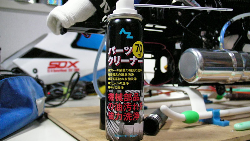 こんな感じで整備終了。軽い気持ちで始めましたが、なんだかんだと結構時間がかかりました。オマケですが、先日コメリで見つけたAZ製の小型パーツクリーナーをご紹介。普通のパーツクリーナーは結構大きく(840mL)持ち運びには不便ですが、こいつは小さくて便利そうなので一つ購入。お値段98円也。容量単価的には約4~5倍程度ですが、アルコールだけでは落ちにくい汚れにいかがでしょうか?