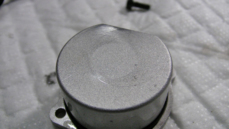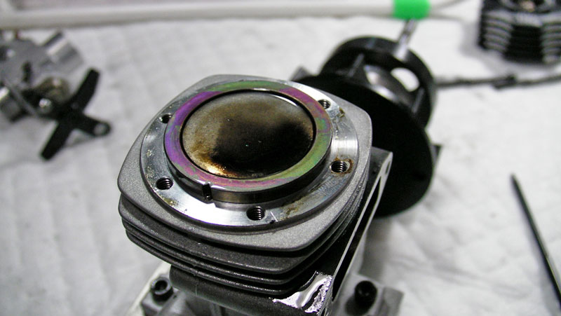 ギヤを外したのでついでにエンジンを降ろしました。ピストンは特に傷などもなくキレイでしたが、上部のカーボン堆積を認めました。とりあえず清掃。OS55になってからバックプレートのシール密封性が良くなったのでなかなか外れなかったのですが、なんとか外してみたところ意外にキレイでした。一安心。ついでに芯出しも頑張りましたが4/100で挫折